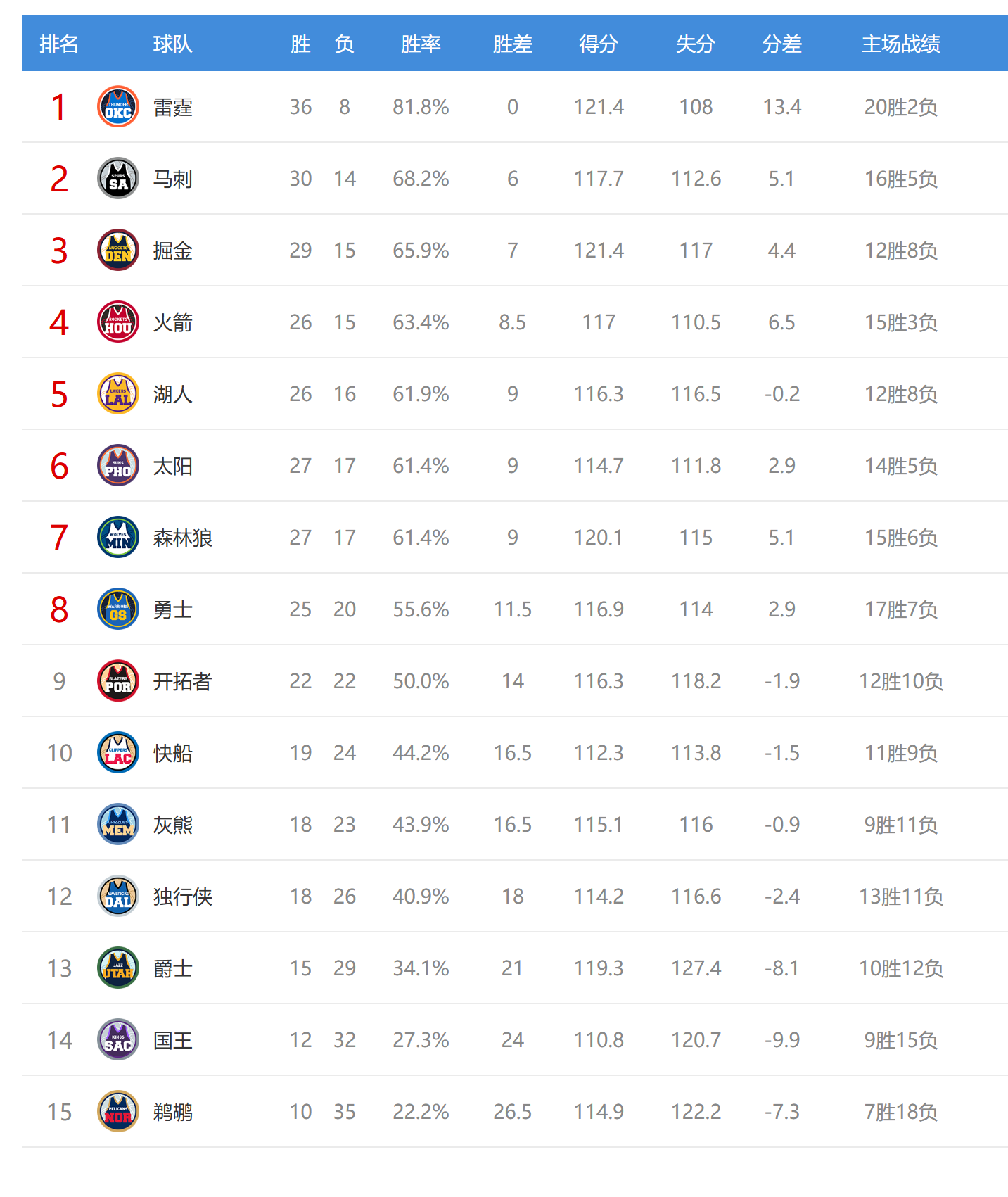 国王输球后12胜32负,排名西部第14。